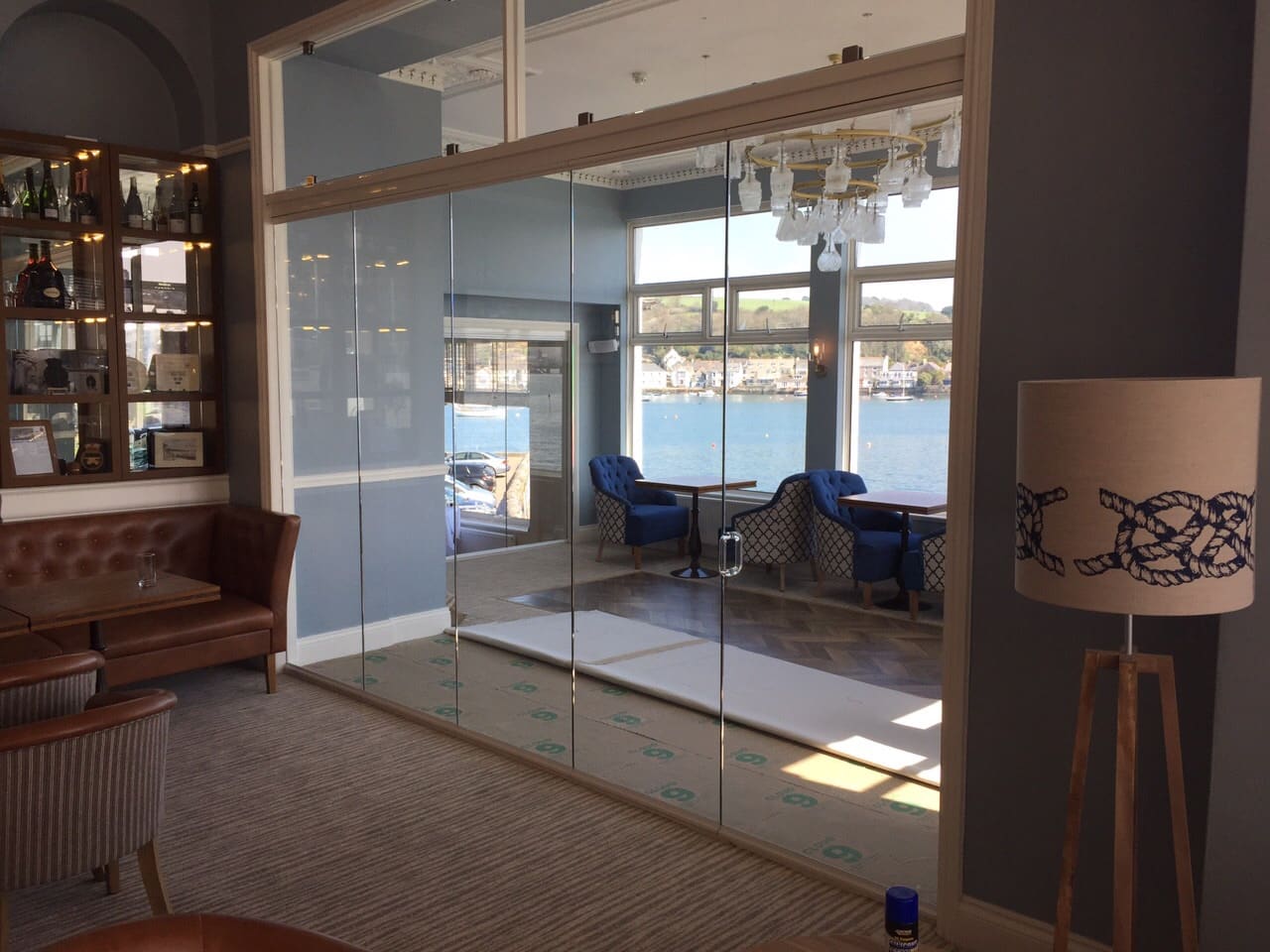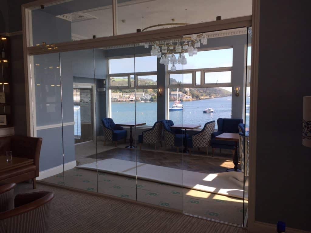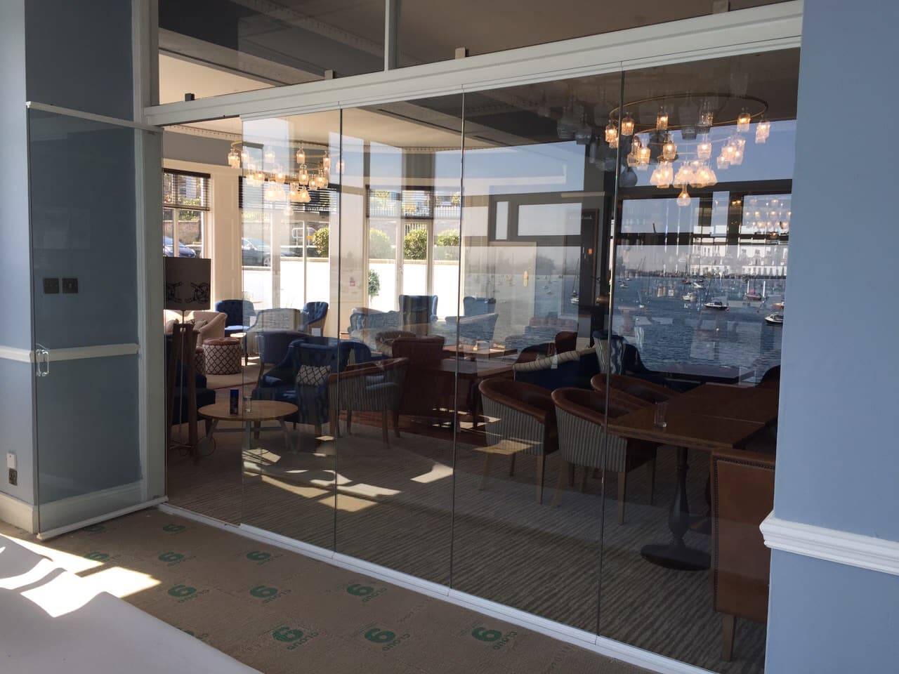 Frameless Glass Curtains Ltd fitted their elegant and contemporary frameless bifolding doors internally. A large room in a hotel can often create opportunities for multiple uses and this is where our doors can help.