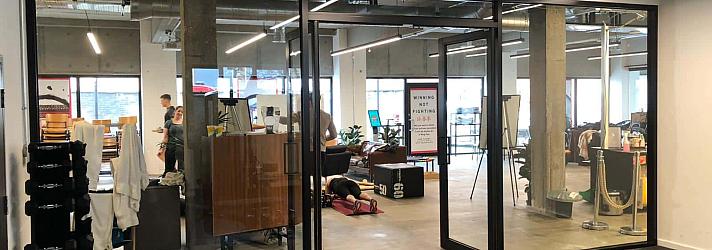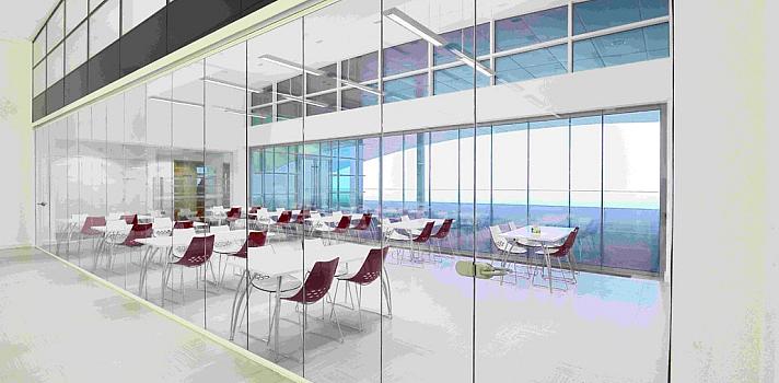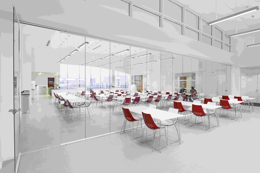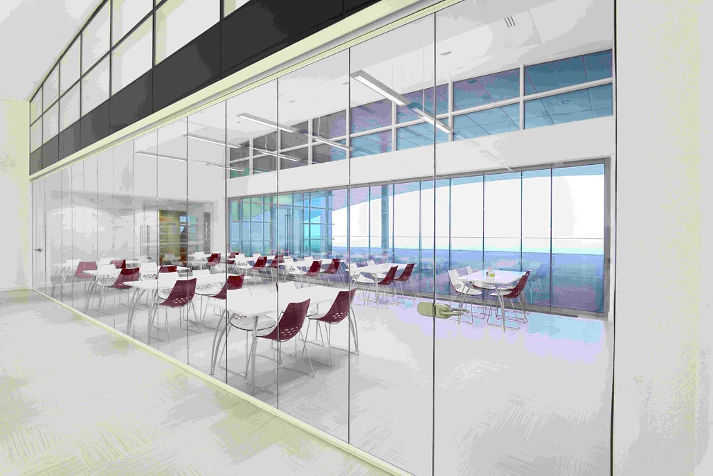 The frameless design creates striking visual impact while maintaining the modern aesthetic of the facility. When open, the space transforms into a larger, unified area; when closed, it maintains clear sight lines while providing acoustic separation.